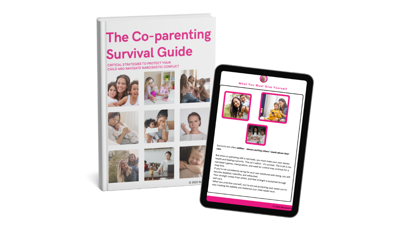 The Co-parenting Survival Guide is your step by step, emotional and tactical guide to navigating life with a narcissistic ex without losing your sanity, your confidence, or your connection with your child.